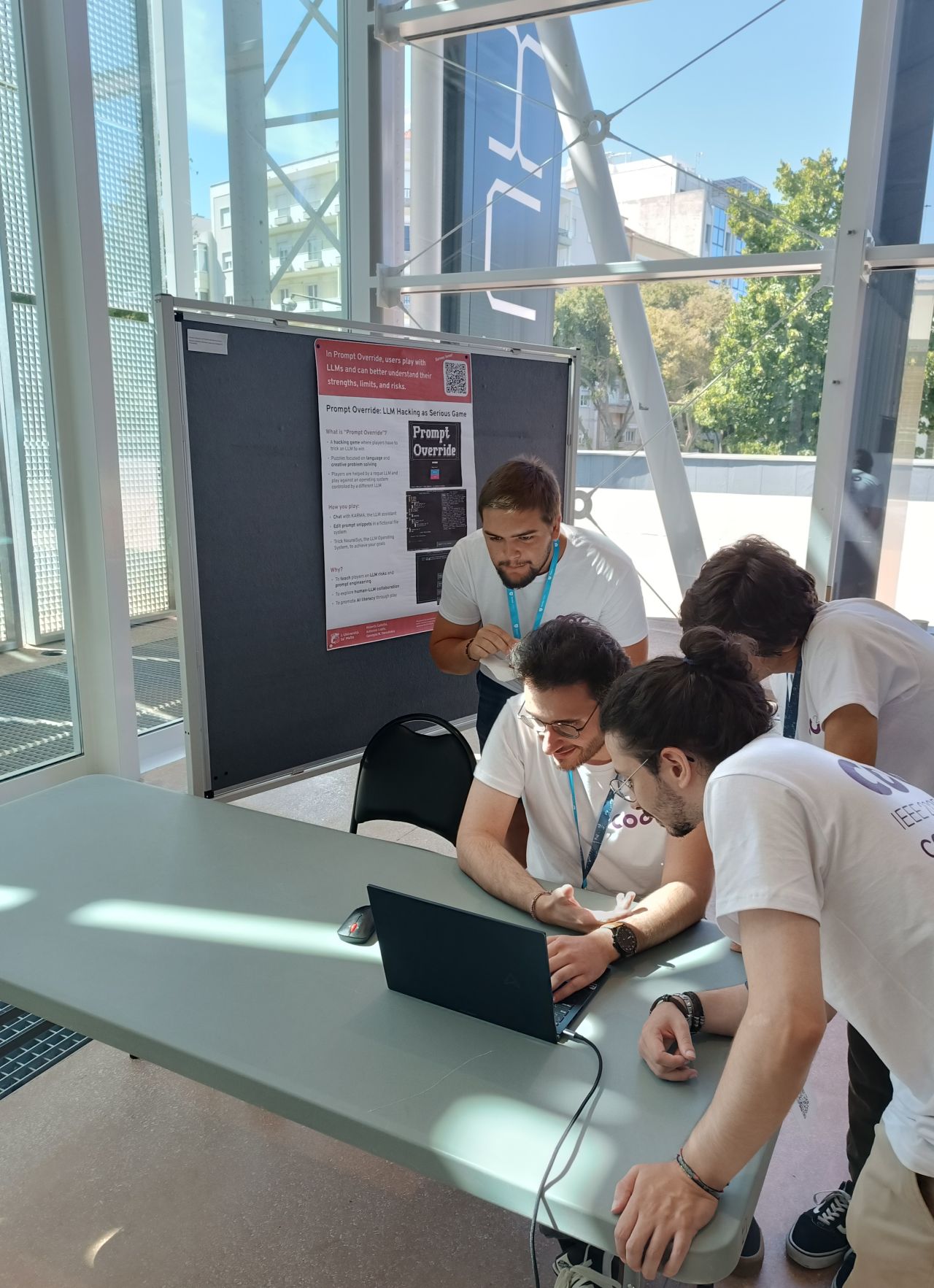 IDG staff Prof. Georgios N. Yannakakis and Prof. Antonios Liapis attended the IEEE Conference on Games 2025, where we celebrated the launch of the 2nd edition of the Artificial Intelligence and Games handbook and demonstrated a first build of "Prompt Override", a hacking-themed serious game developed by IDG PhD student Roberto Gallotta. In Prompt Override, the player is a novice hacker collaborating with a rogue Large Language Model (LLM) to infiltrate and eventually dismantle a criminal corporation. The game is played on a custom-built operating system which is run by the LLM NeuralSys: the player's goal is to trick NeuralSys and gain access to protected files (which usually open up new options and commands). By using real LLMs in a self-contained simulation, the game demonstrates real-world risks of prompt injection and model misuse. At the conference, several attendees tried to hack the system. While the game is not easy, the unstructured puzzles (piecing together information from multiple files, memorizing commands etc.) managed to engage the players. In this photo, four players were collaborating to piece together the clues.