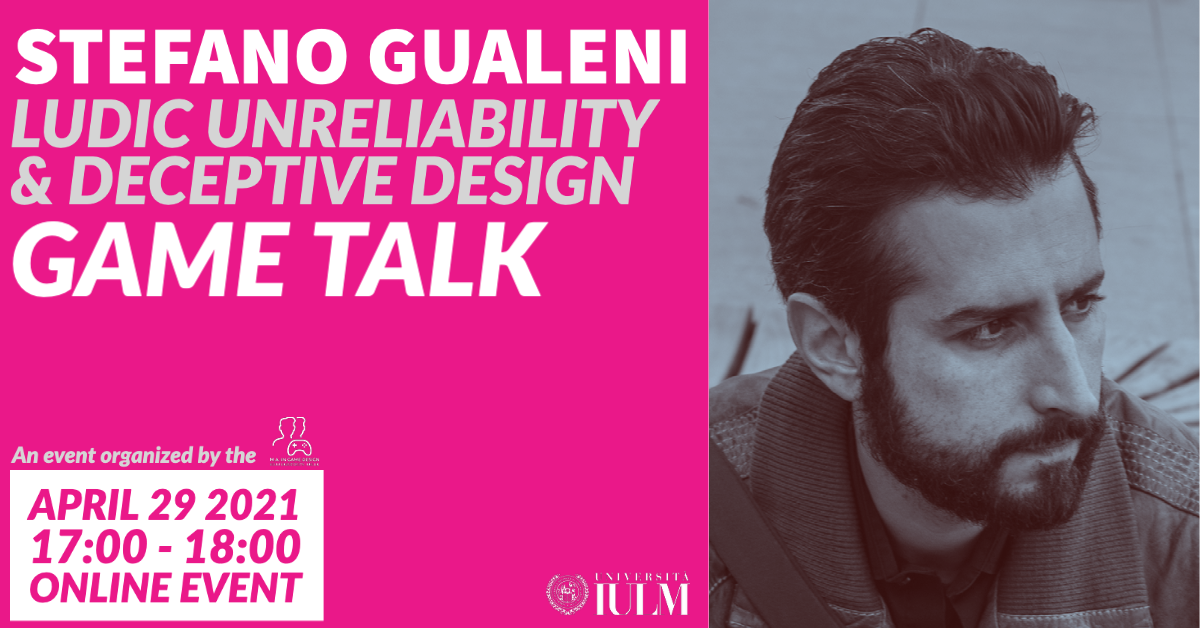 Drawing from narratology and design studies, Stefano Gualeni introduces the ideas of the “implied designer” and “ludic unreliability”. Those two fundamental notions are then leveraged to present the idea of “deceptive game design”, a subset of the wider category of transgressive game design. In this talk, Gualeni discusses deceptive design not only understood as an intentionally manipulative practice, but also as one that aims to provoke specific experiential and emotional responses that are in the interest of players. Several examples and strategies for deceptive design will be examined during the talk, which will conclude with the proposition of a taxonomy for deceptive design decisions on the basis of their shared qualities (overt, covert, ludic, and paraludic).